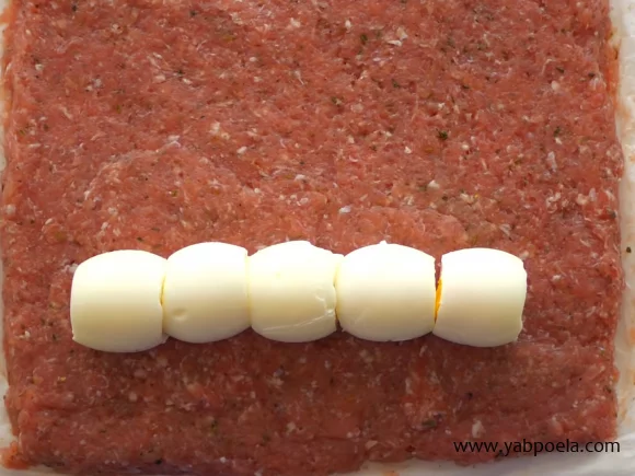На широкий бік пласта ближче до краю викладаємо яйця щільно один до одного.