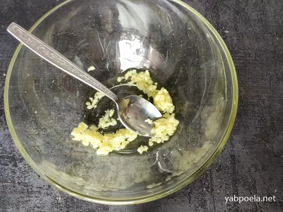 Видавлюємо часник, вливаємо до нього трохи оливкової олії та перемішуємо.
