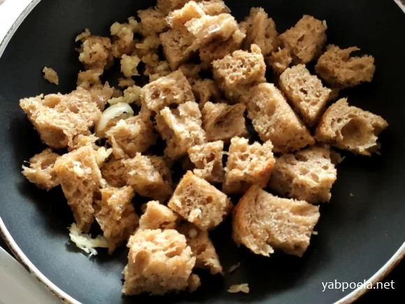 Перемішуємо хліб нарізаний кубиком з оливково-часниковою сумішшю.