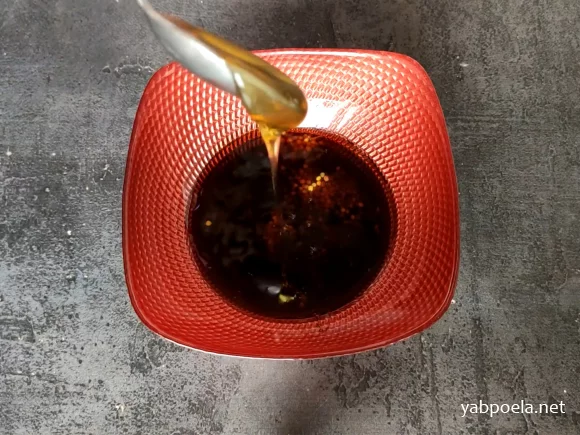 В окремій ємності зробимо заправку. Перемішуємо соєвий соус з бальзамічним оцтом, гірчицею в зернах та медом.