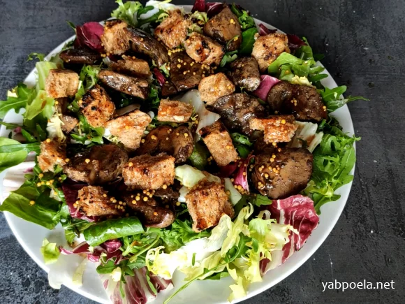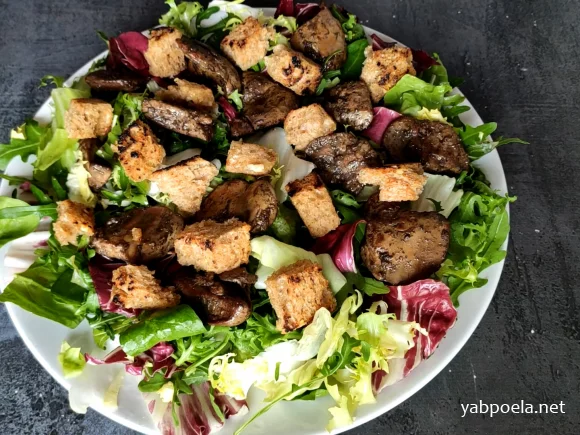 Цей салат з курячою печінкою та часниковими грінками – справжнє поєднання ніжності та хрусткої текстури. Ароматна печінка чудово поєднується з міксом свіжого салатного листя та пікантною заправкою на основі оливкової олії, соєвого соусу, бальзамічного оцту, зернистої гірчиці та меду.