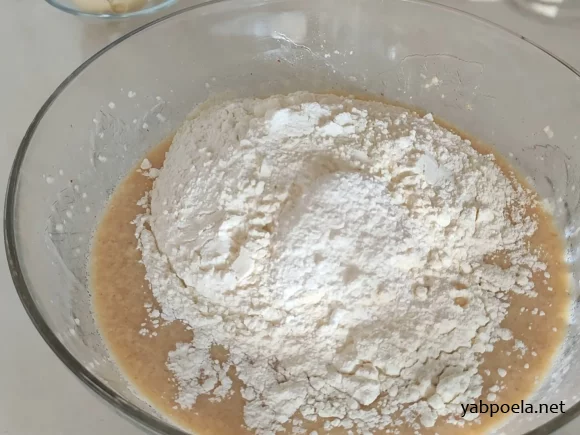 Всипаємо просіяне борошно з розпушувачем. Замішуємо тісто.
