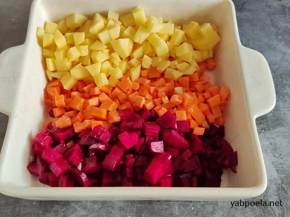 Буряк, морква та картопля наріжте шматочками. Складіть у форму для запікання, полийте 1 ст. олії.