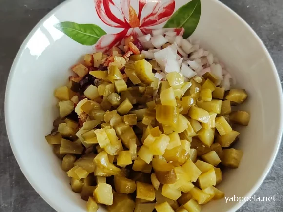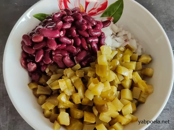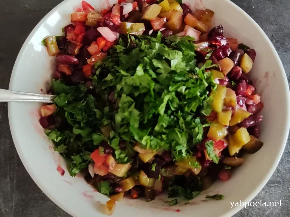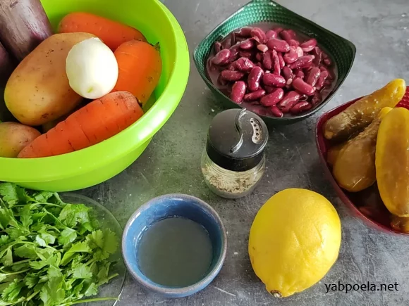 Буряк, картопля і морква після запікання набувають насиченого смаку, а додавання солоних огірків, свіжої цибулі та петрушки робить салат свіжішим і ароматнішим. Червона квасоля додає білок і робить блюдо повноцінним навіть без м'яса.