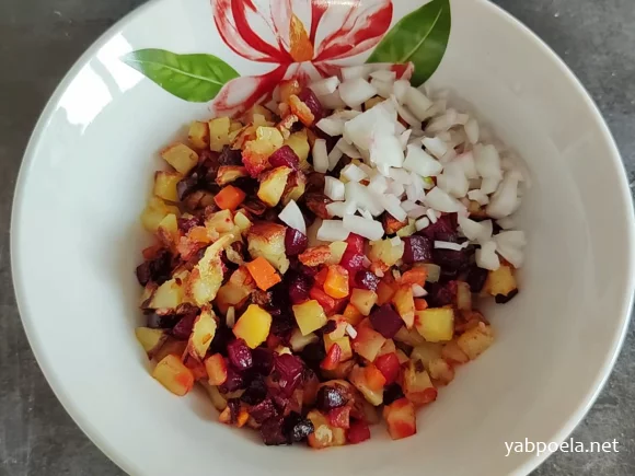 Готові овочі перекладаємо у салатник. Додамо нарізану цибулю.