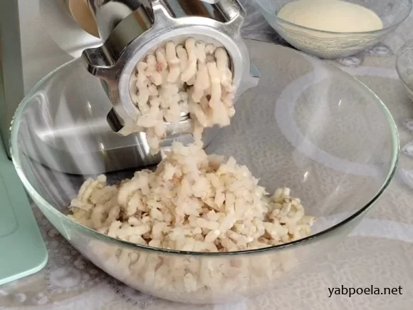 Якщо філе мінтая було заморожене, розморозьте його та злегка відтисніть від зайвої рідини — це важливо, щоб фарш не вийшов водянистим. Наріжте рибу невеликими шматочками для м’ясорубки.