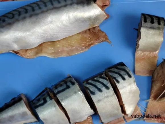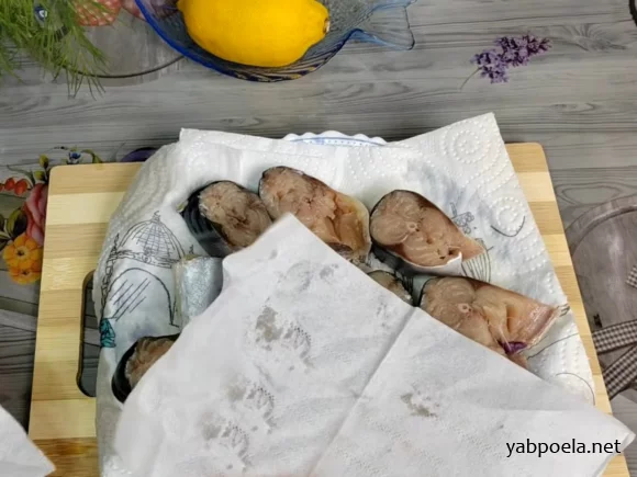 Скумбрію розморожуємо, очищаємо від голови, нутрощів і чорної плівки всередині черева — вона дає гіркоту. Рибу ретельно промиваємо й обсушуємо паперовим рушником, щоб не залишилося вологи. Нарізаємо скумбрію на порційні шматочки товщиною приблизно у два пальці.