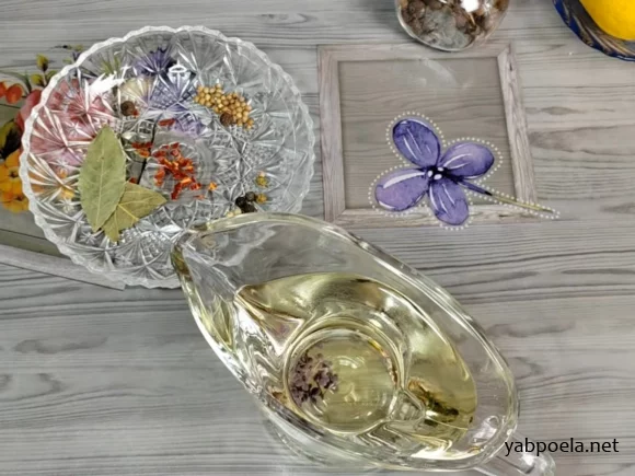 Поки риба просолюється, підігріваємо соняшникову олію — вона має стати просто теплою, не гарячою. Додаємо коріандр, суміш перців, кілька духмяних горошин, лавровий лист і пластівці гострого перцю. Перемішуємо й даємо настоятися, щоб спеції віддали аромат.