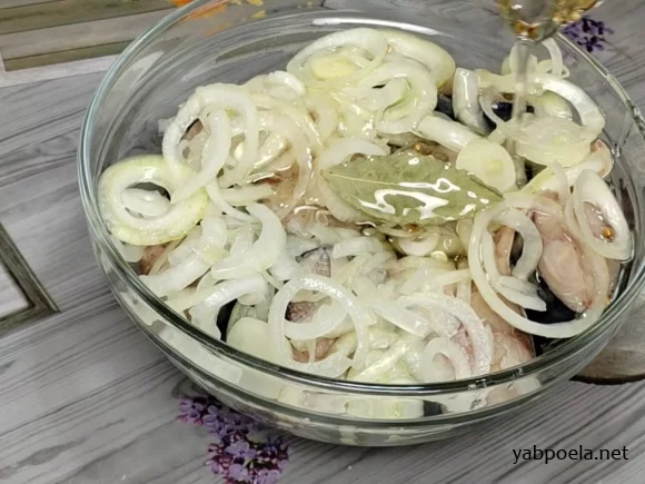 На дно миски або баночки викладаємо шар цибулі, потім шар риби. Скроплюємо лимонним соком і поливаємо ароматною олією. Повторюємо шари до кінця інгредієнтів. Зверху вливаємо залишки олії.