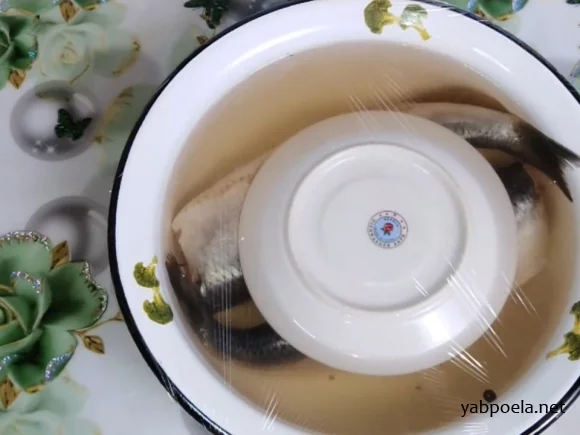 Заливаємо підготовленого оселедця охолодженим розсолом. Зверху кладемо тарілку або кришку, щоб риба була повністю покрита рідиною. Накриваємо плівкою й залишаємо за кімнатної температури на 4–5 годин.