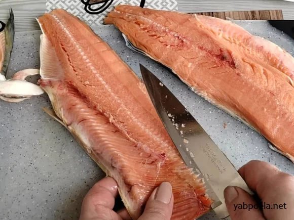 Перевірте філе руками на наявність дрібних кісточок (пінцет допоможе їх видалити), зріжте плавці та непотрібні частини.