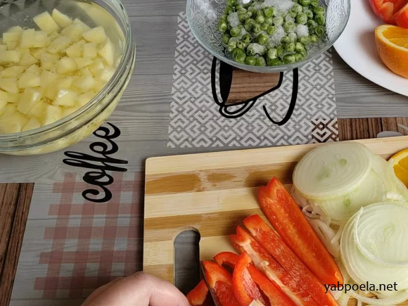 Наріжте цибулю кільцями. Болгарський перець наріжте невеликими скибочками або кубиком.