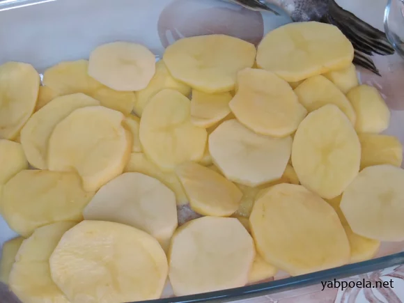 - Перекладіть підготовлену рибу зверху на картопляну «подушку» у формі.