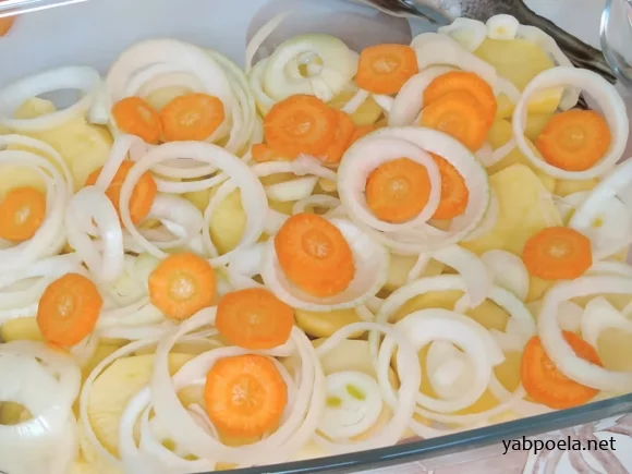 - Відправте нарізану цибулю (і моркву, якщо використовуєте) до картоплі у форму.