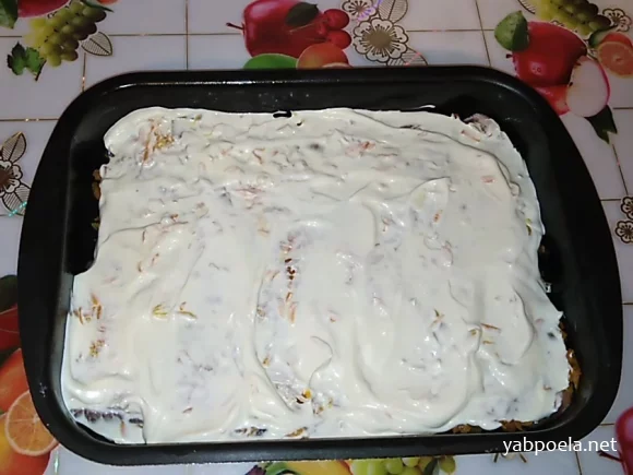 - Покриття: Акуратно викладіть і розподіліть соус зверху на овочеву шубу. Намагайтеся не сильно змішувати соус із морквою, а просто обережно розмажте.