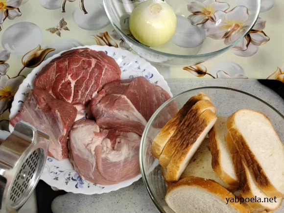 - М'ясо та Цибуля: Наріжте м'ясо (800 г) і велику цибулину (250 г) на довільні шматочки, зручні для пропускання через м'ясорубку.