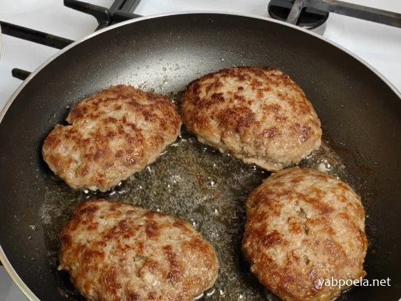 - Смаження без панірування: Викладіть котлети. Панірування (борошно чи сухарі) не потрібне, оскільки у фарші достатньо хліба. Котлети чудово смажаться без нього.
