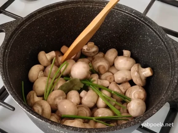- Дочекайтеся, поки гриби добре закиплять (вони осядуть і дадуть свій сік).