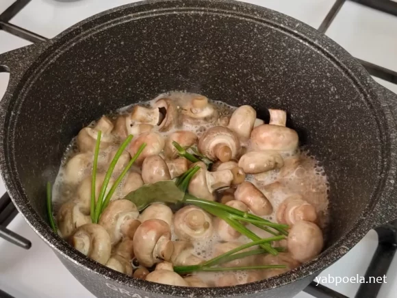 - Як тільки гриби добре закипіли, накрийте кришкою, зробіть нагрів трохи нижче і варіть із цього моменту не більше 5–7 хвилин. Зніміть з плити.