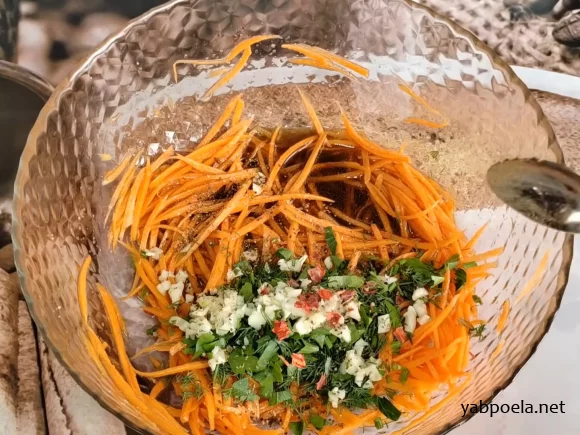 - Наріжте моркву тонкою соломкою (можна використати корейську тертку або нарізати вручну).