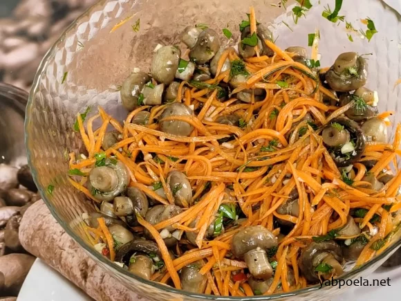 Це шикарна, хрустка, кисло-солодка та трохи гостра закуска. Невеликі печериці швидко відварюються та маринуються разом із тонко нарізаною морквою в ароматному олійно-оцтовому соусі з коріандром та часником. Готуйте її за 2–3 години до подачі або заздалегідь — у холодильнику вона стане лише смачнішою (до 3–4 днів).