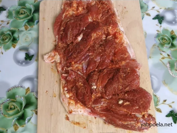 Розріжте товсті м'ясні частини рульки, щоб розкрити її «книжкою» і створити рівномірний пласт. Зрізані шматочки м'яса використовуйте, щоб заповнити тонкі або порожні місця.
