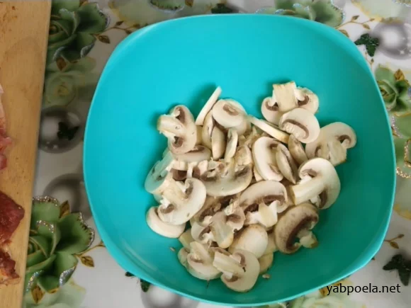 Наріжте 250 г печериць уздовж досить товстими шматочками (не дрібно).
