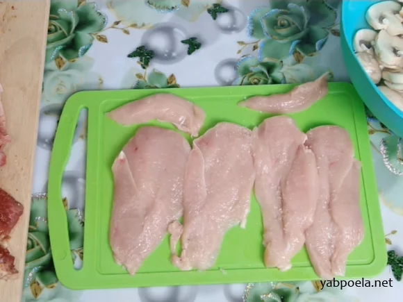Спочатку викладіть на рульку відціджені печериці. Потім — солене куряче філе.