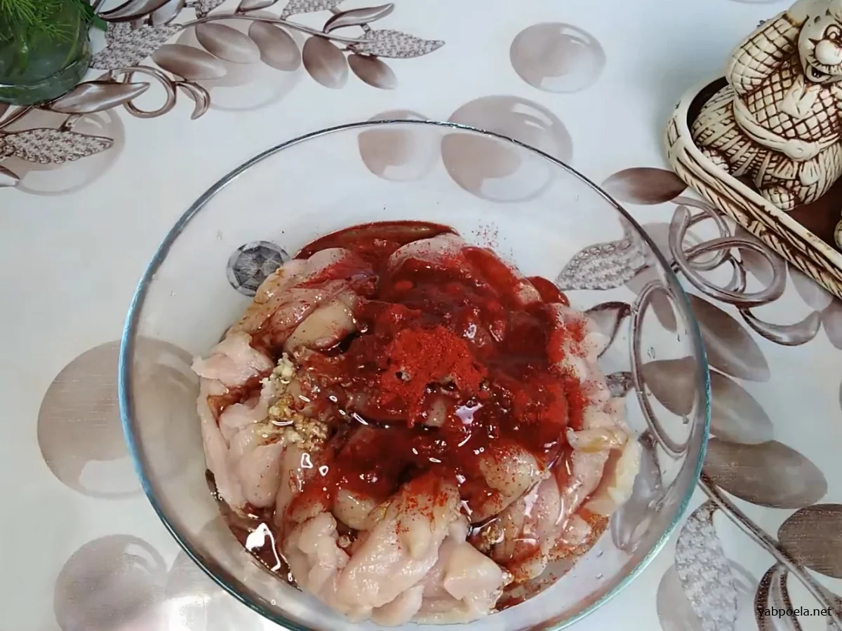 - У миску з м'ясом додайте 3 ст. л. соєвого соусу, 5 ст. л. олії, 1 ч. л. паприки, сіль та перець. Вичавте 2 зубчики часнику.