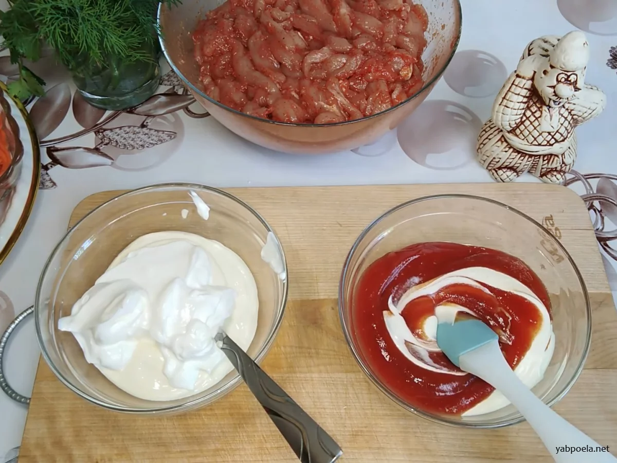 - Білий соус: Змішайте сметану та майонез (1:1). Додайте натертий часник, чорний перець та дрібно нарізану кінзу. Перемішайте.