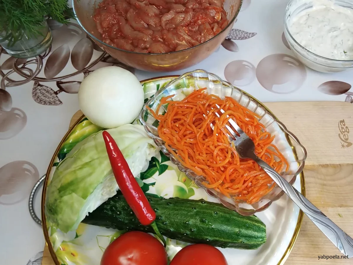 - Шари: Капуста ➔ Морква по-корейськи ➔ М'ясо (щедро!) ➔ Цибуля ➔ Гострий перчик (за бажанням) ➔ Ще трохи соусу ➔ Огірки ➔ Помідори.