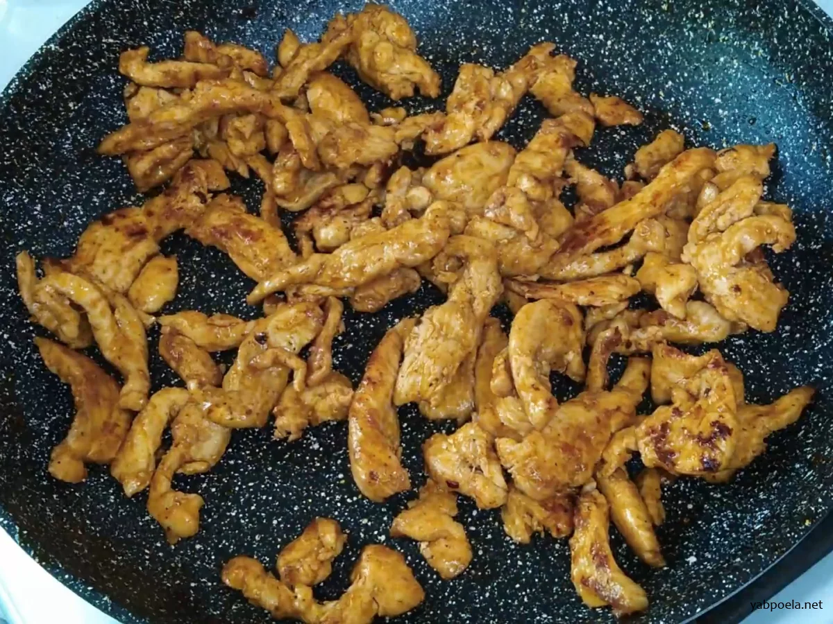 Розігрійте суху сковороду (олія вже є в маринаді). Викладайте курку порціями (в один шар).Смажте на сильному вогні 4–5 хвилин (по 2–3 хвилини з кожного боку) до золотавого кольору. Не пересушуйте! М'ясо має бути дуже соковитим.