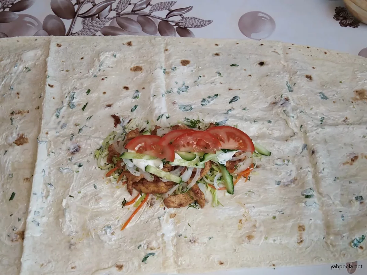 - Акуратно загорніть шаурму конвертом: спочатку підігніть бічні краї, потім загорніть щільним рулетом знизу вгору.
