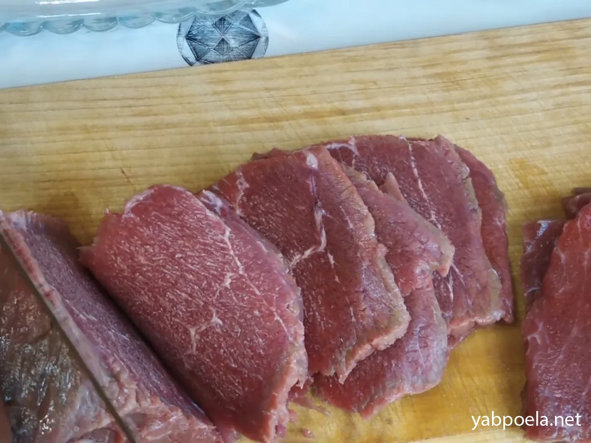 Щоб нарізати м'ясо ідеально тонкими слайсами (не більше 3 мм), його бажано заздалегідь трохи підморозити в морозилці. Наріжте підморожене м'ясо впоперек волокон тонкими пластинками. Складіть у глибоку миску.