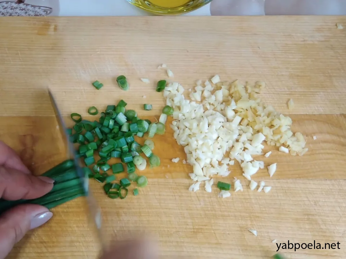 Часник та імбир дрібно наріжте ножем (або натріть). Зелену цибулю дрібно поріжте.