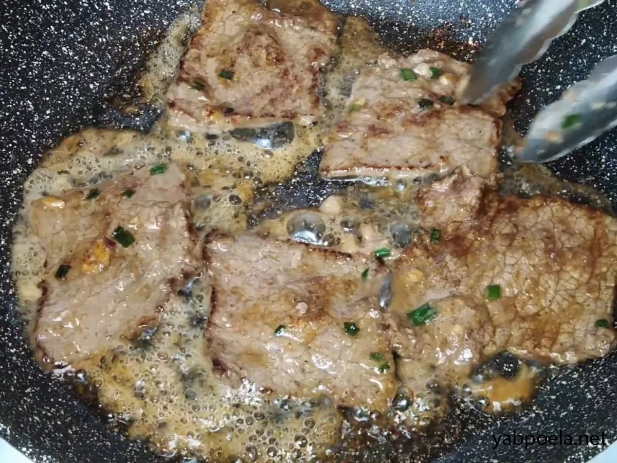 - Смажте на сильному вогні дуже швидко — буквально 3–4 хвилини на партію. Як тільки м'ясо змінило колір і трохи підрум'янилося — перевертайте і знімайте.Увага: Не пересушіть! Тонка яловичина готується миттєво.