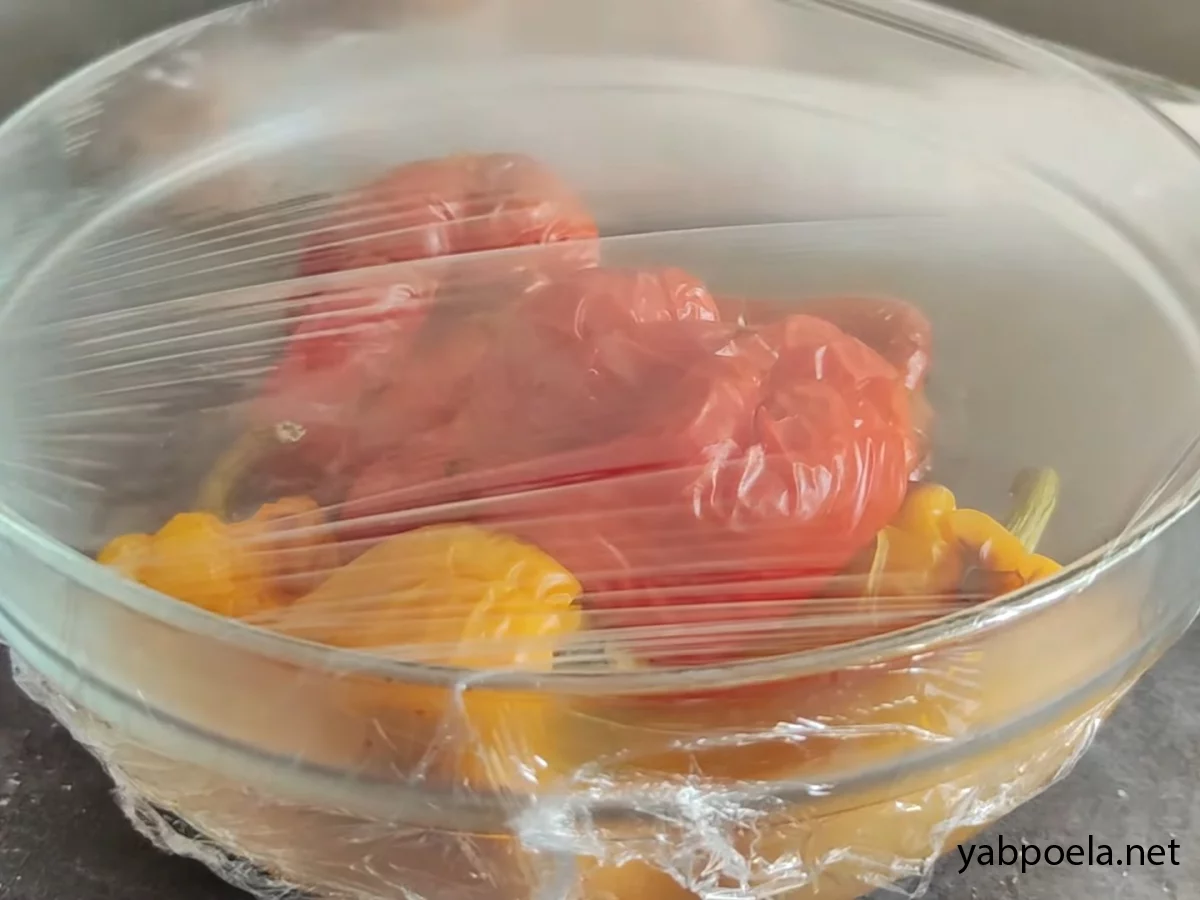 Готові перці відразу складаємо в пластиковий пакет або в миску, яку щільно накриваємо харчовою плівкою. Залишаємо на хвилин 20.