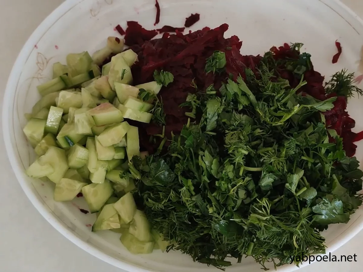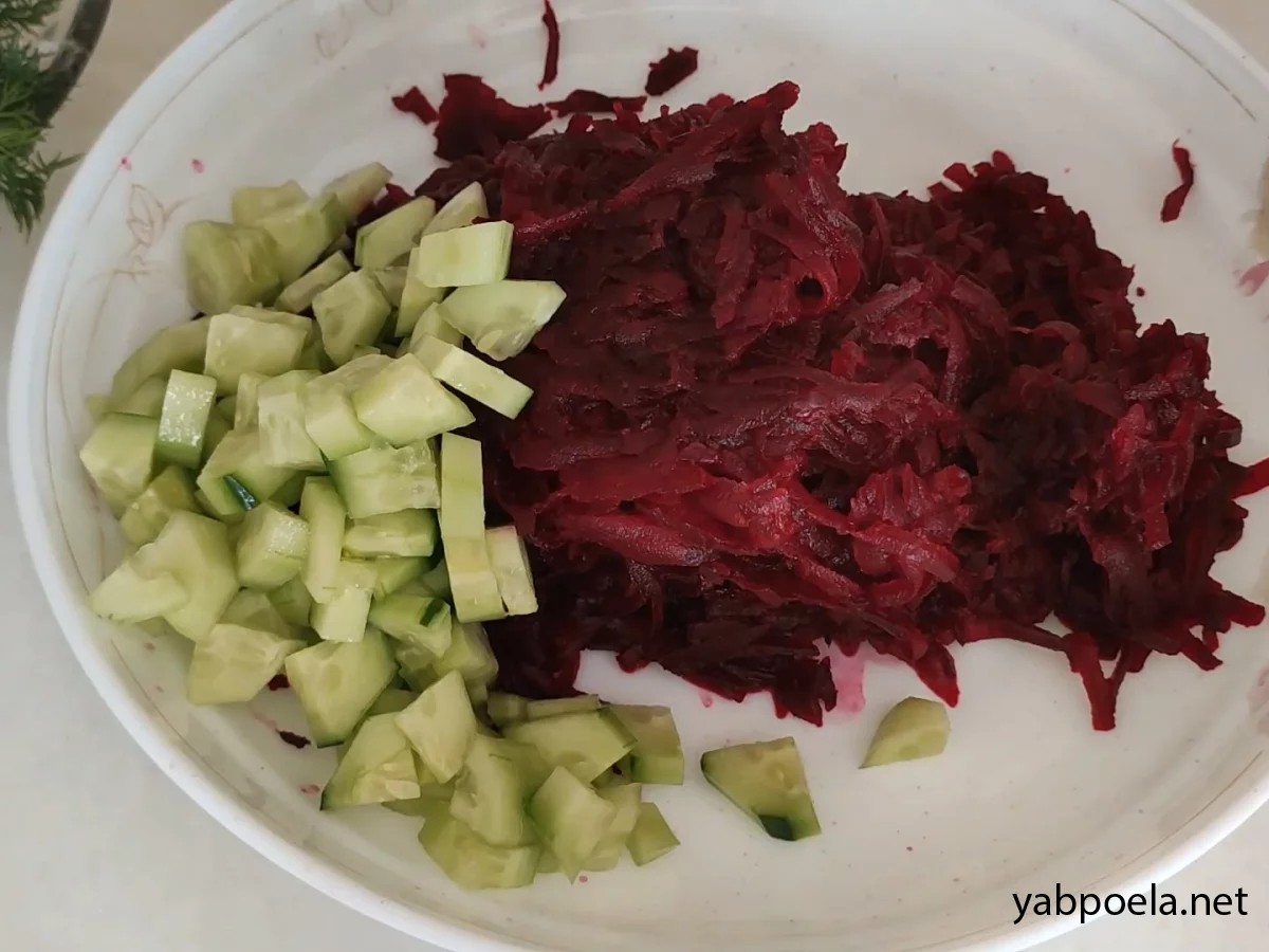 Нарізаємо огірки маленькими шматочками, додамо до буряків.
