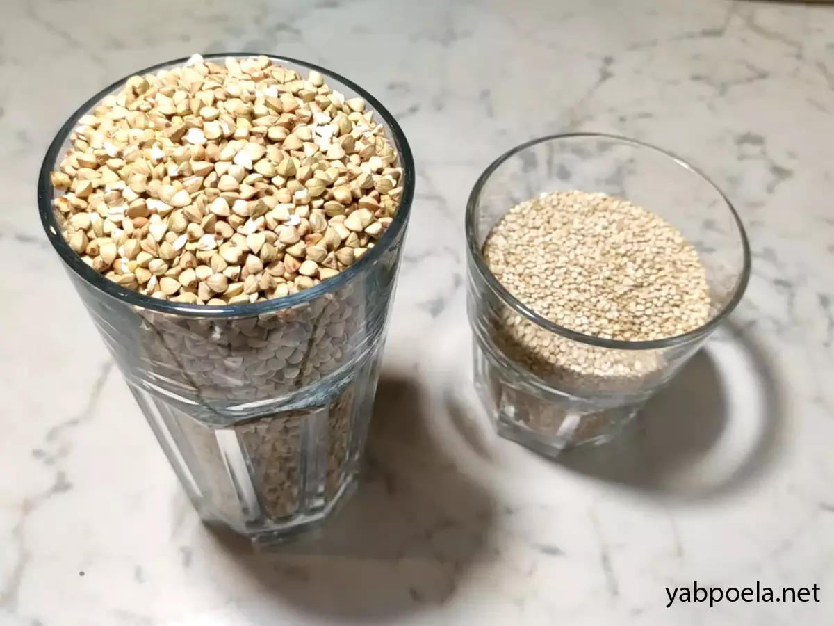 Гречку і кіноа потрібно змішати і добре промити кілька разів до прозорої води.