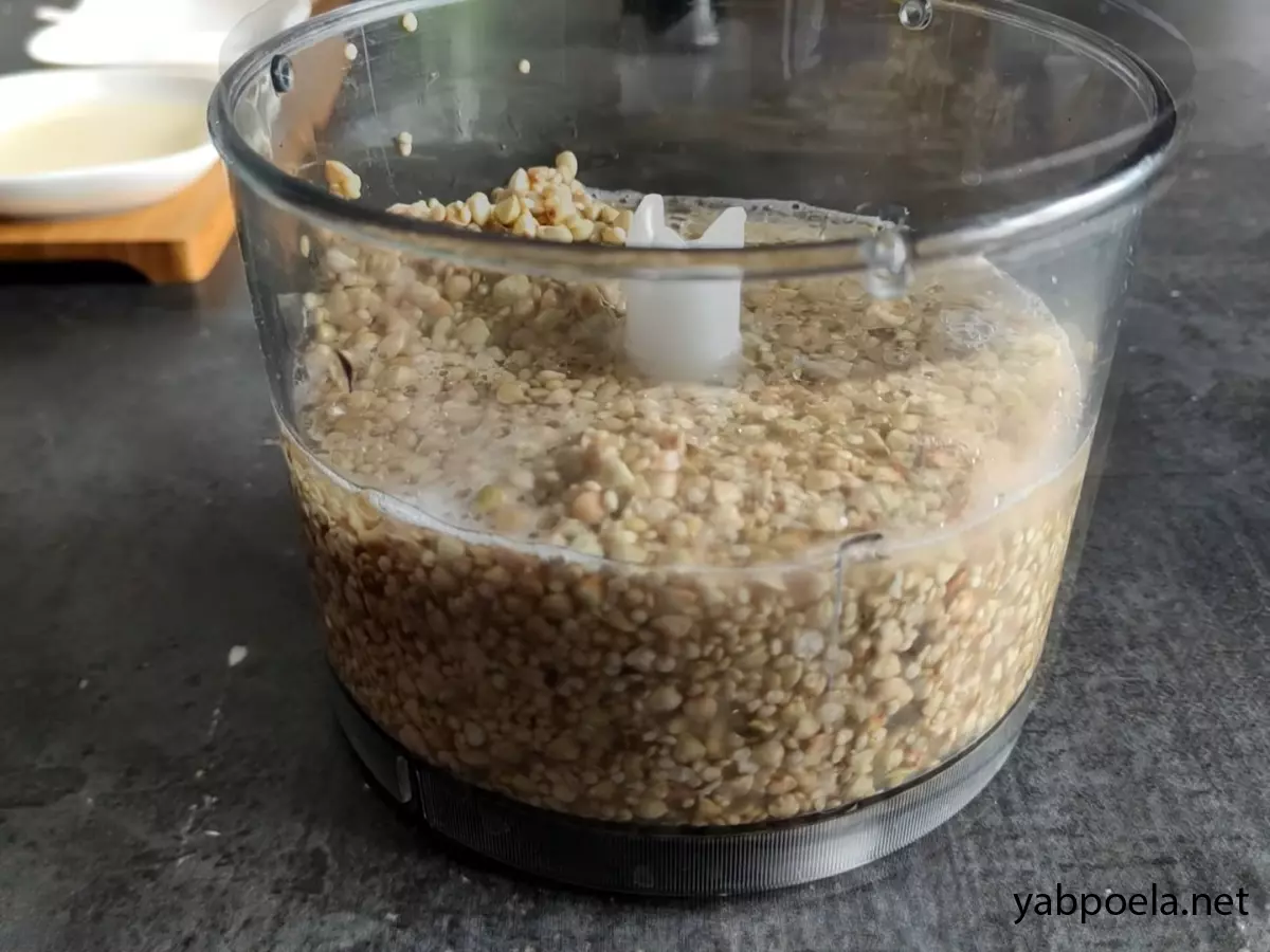 Потім зливаємо воду, гречку та кіноа перекладаємо в чашу блендера. Додамо рослинну олію та чисту воду. Перебиваємо.