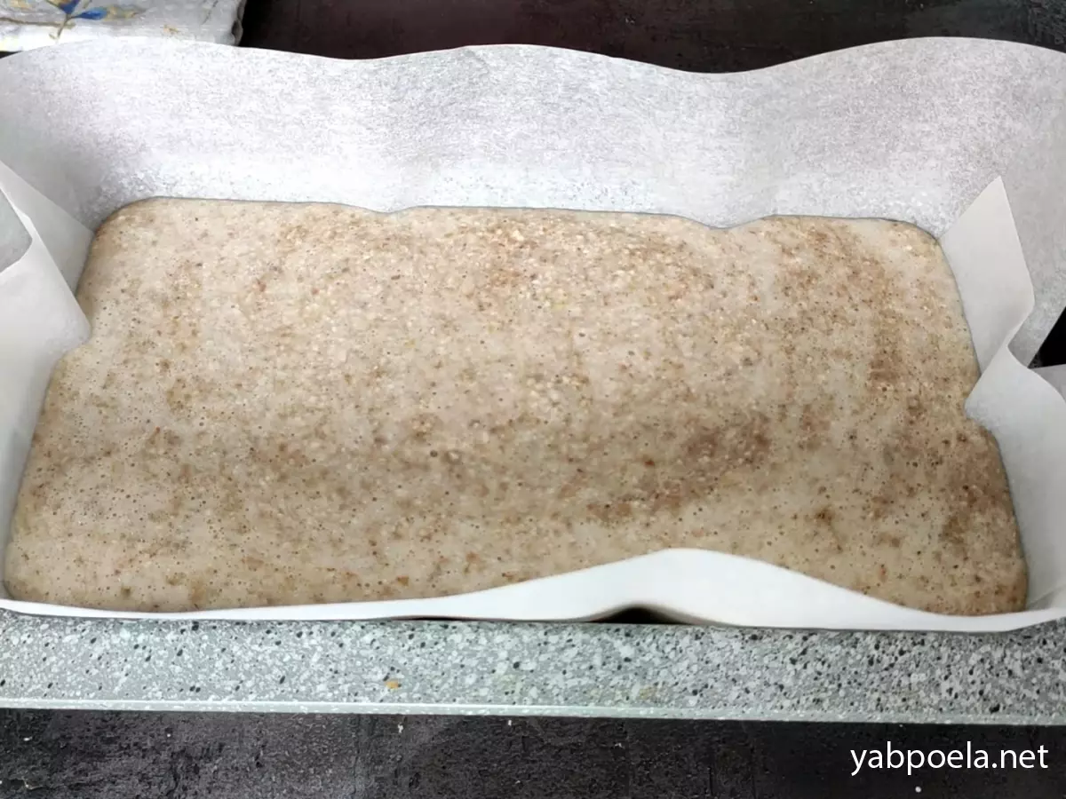 Тепер цю масу переливаємо у форму для випікання хліба, вистелену пергаментом.