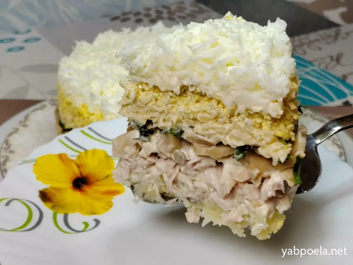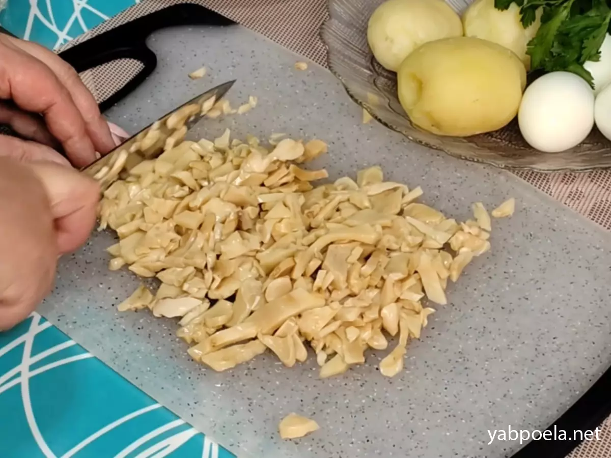 Порада: Можна використовувати і свіжі гриби, обсмажені з цибулею, але з маринованими (шампіньйони або гливи) салат виходить пікантнішим і швидше готується.