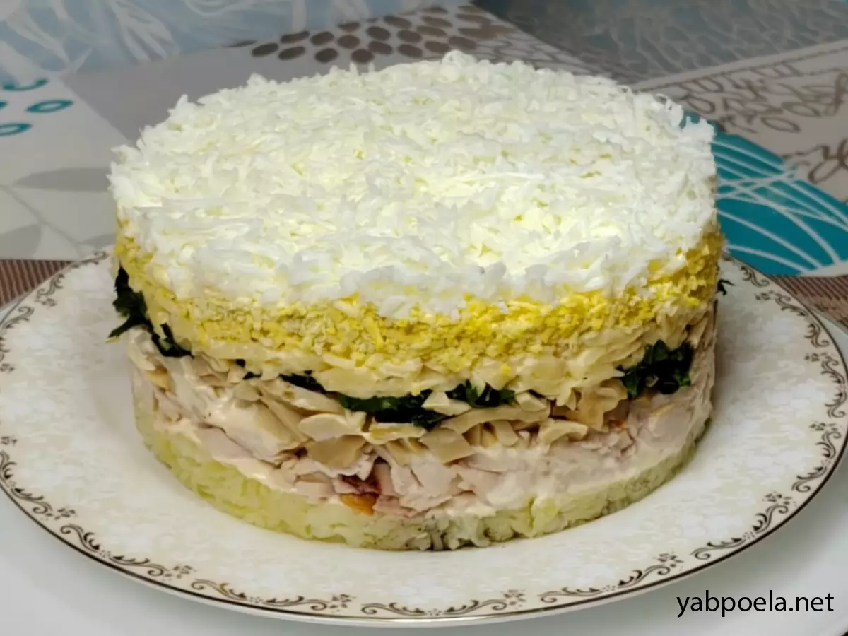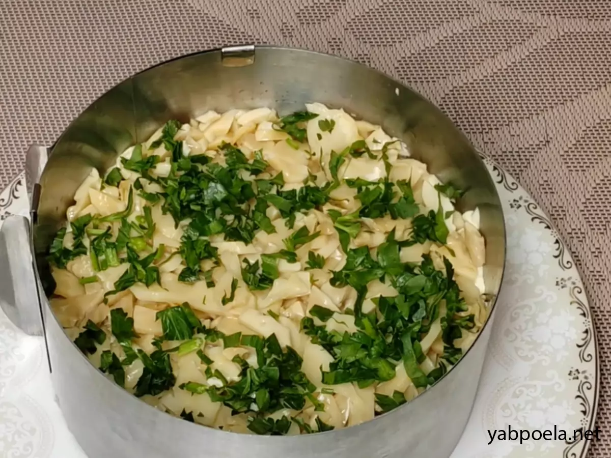 Залиште салат постояти хоча б 30 хвилин (можна прибрати в холодильник). Потім обережно зніміть кулінарне кільце. Салат готовий до подачі!