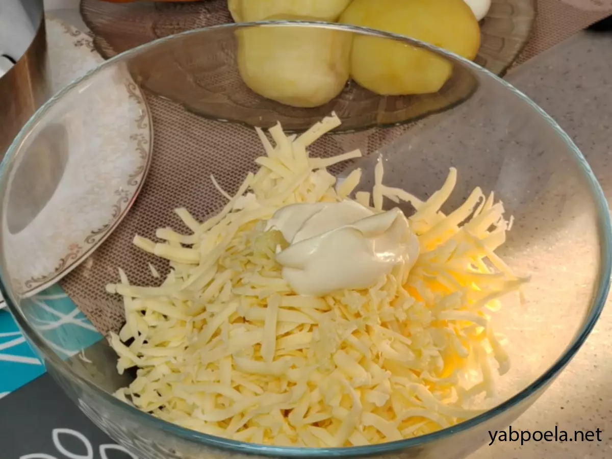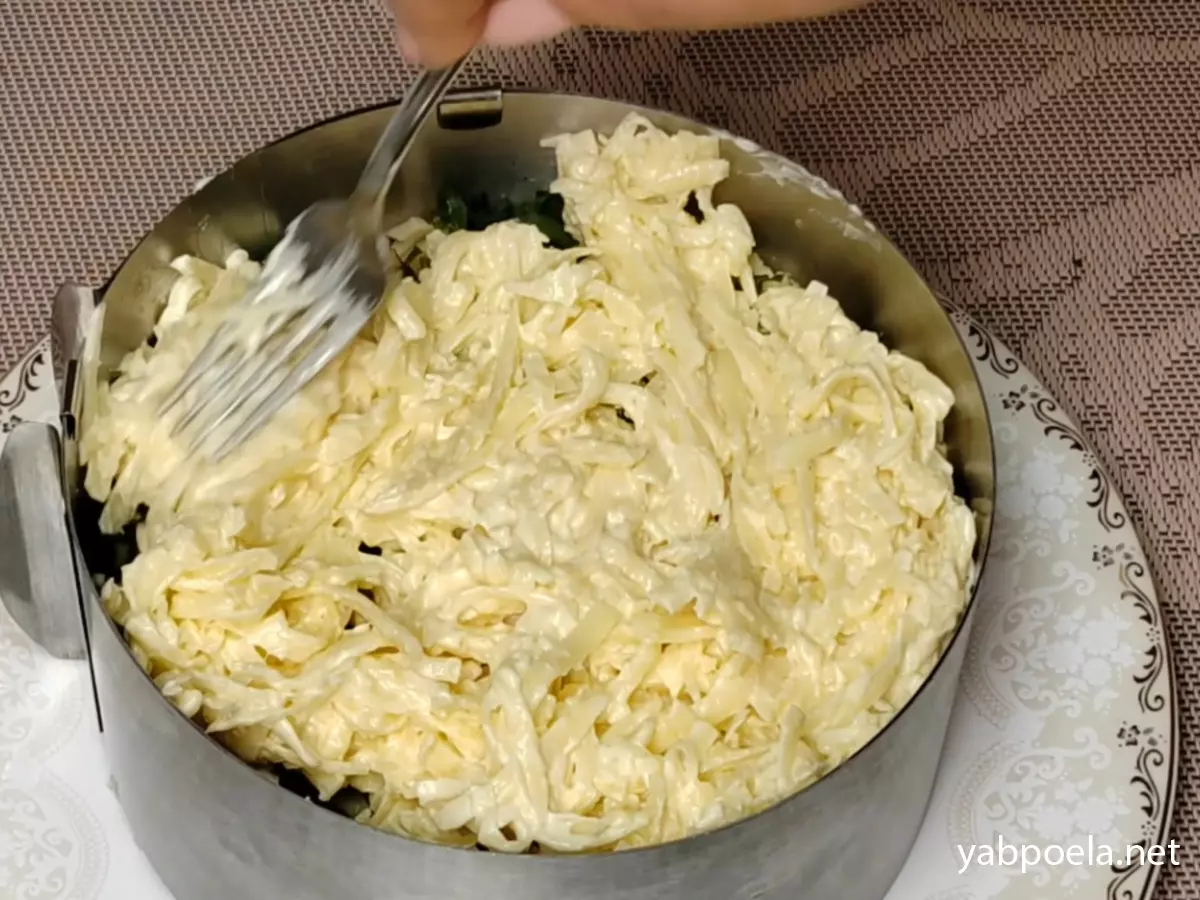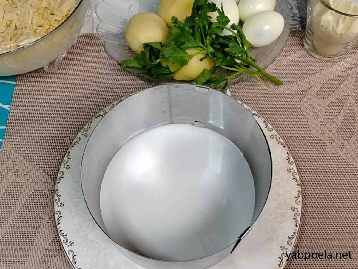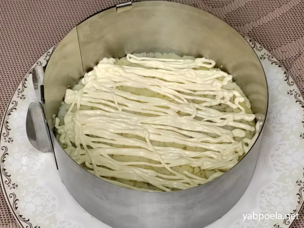 1-й шар (Основа): Натріть відварену картоплю на великій тертці прямо в кільце. Трохи розрівняйте, посоліть і поперчіть до смаку. Зробіть сіточку з майонезу.