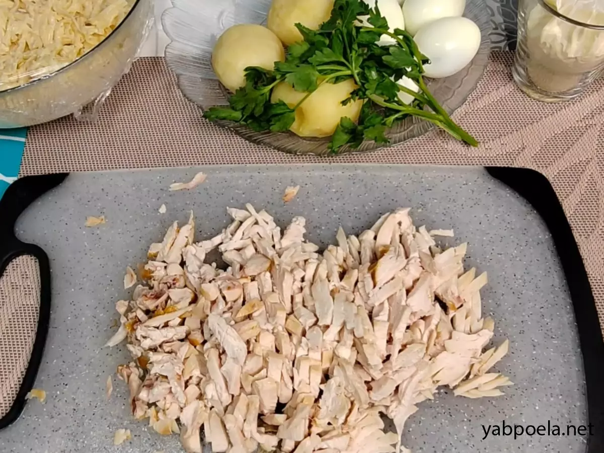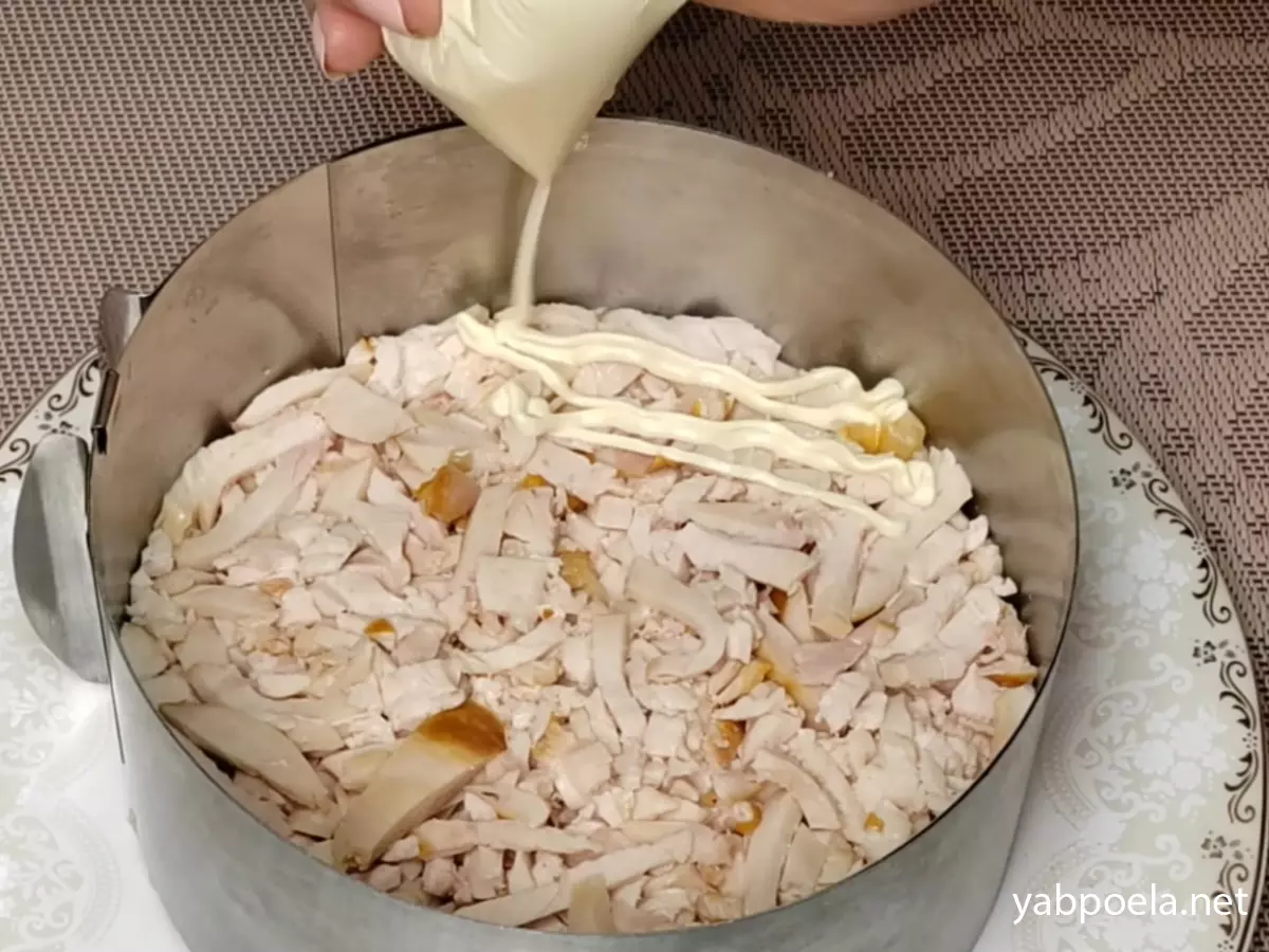 2-й шар (М'ясний): Викладіть нарізану копчену курку. Розрівняйте. Змастіть майонезом.