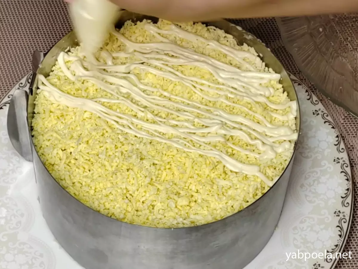 5-й шар (Жовтковий): Натріть жовтки на дрібній тертці. Розподіліть їх пухнастим шаром, не притискаючи. Зверху нанесіть майонез.