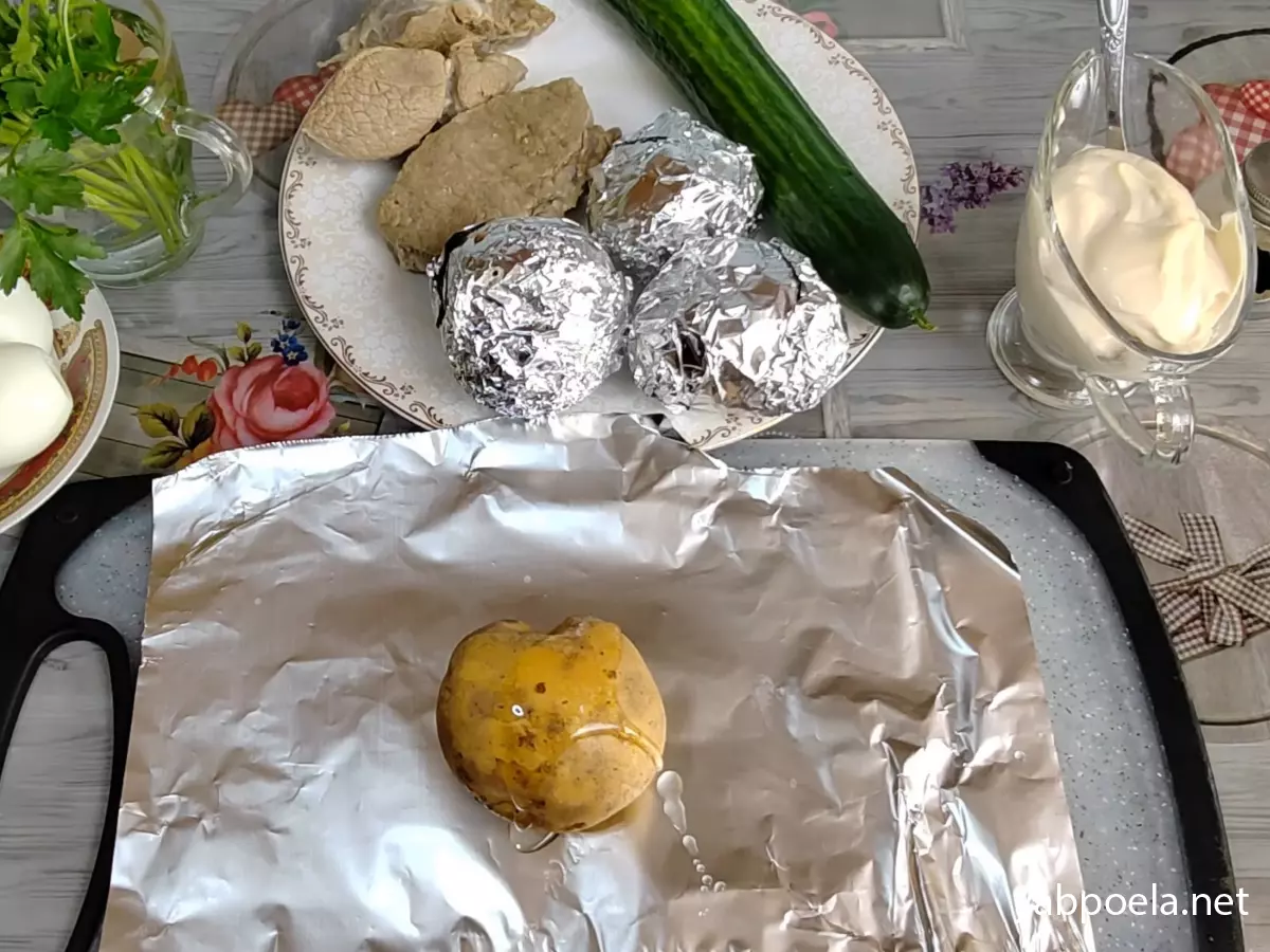 Підготуйте картоплю для запікання. Покладіть чисту картоплину на шматок фольги, додайте 3–4 краплі олії та щільно загорніть. Відправте в духовку на 40–50 хвилин при температурі 180 градусів. Перевірте готовність шпажкою.