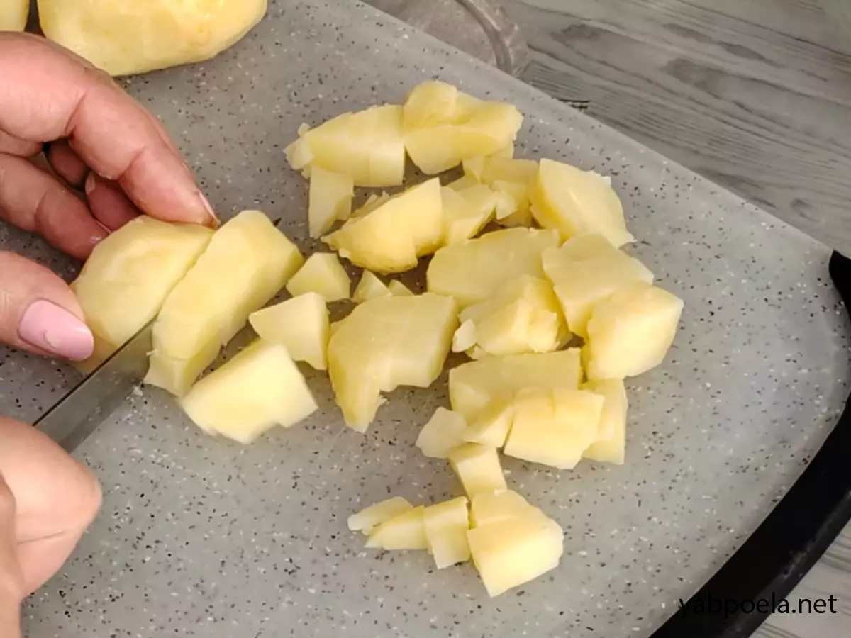 Запечену картоплю, що вже охолола, очистьте від шкірки. Наріжте її середнім кубиком і відправте в салатник.