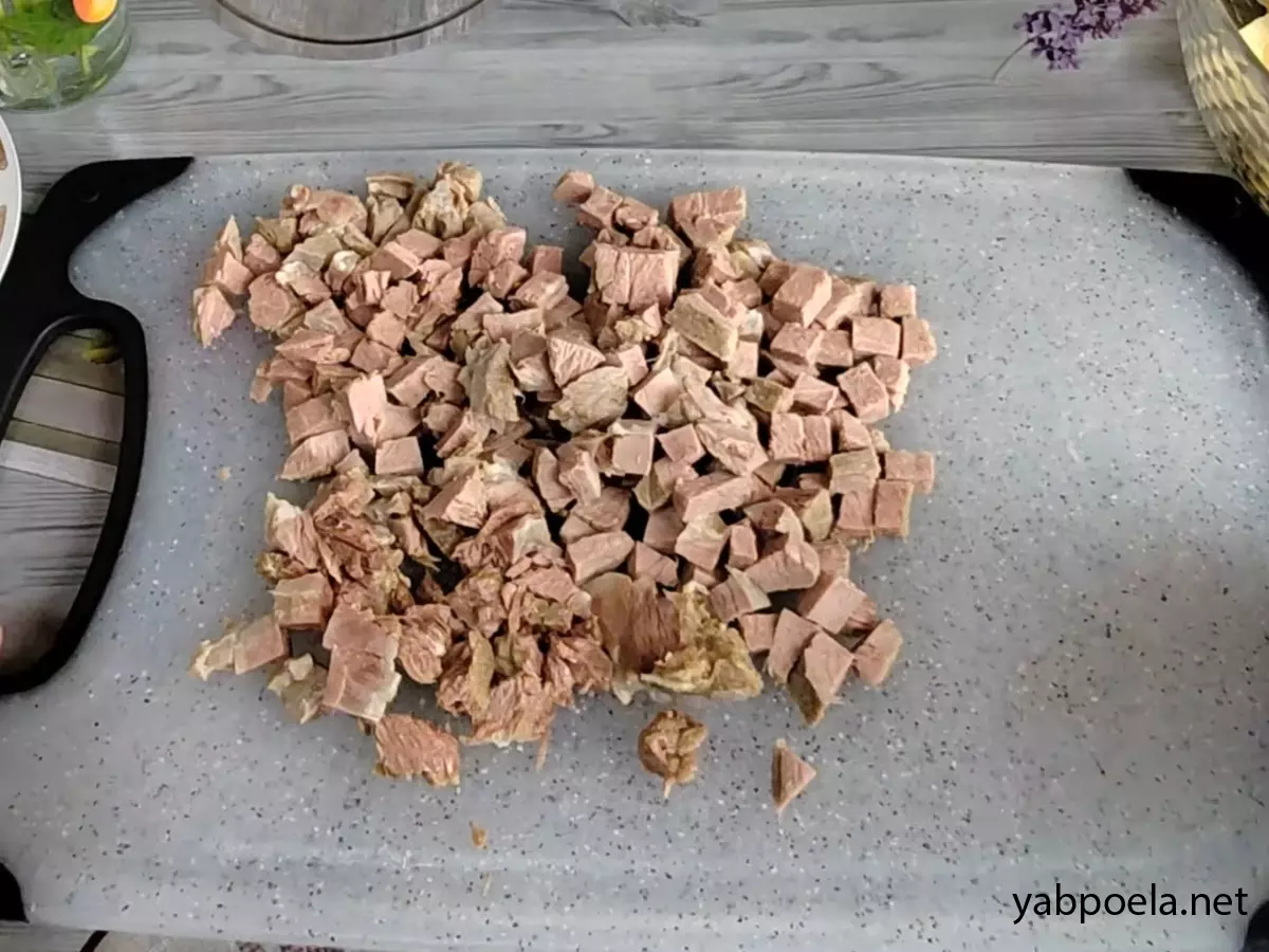 Візьміть відварену яловичину (250 г). Наріжте м'ясо таким самим акуратним кубиком. (Примітка: Яловичина має більш багатий смак, ніж свинина, тому для цього салату вона підходить ідеально).