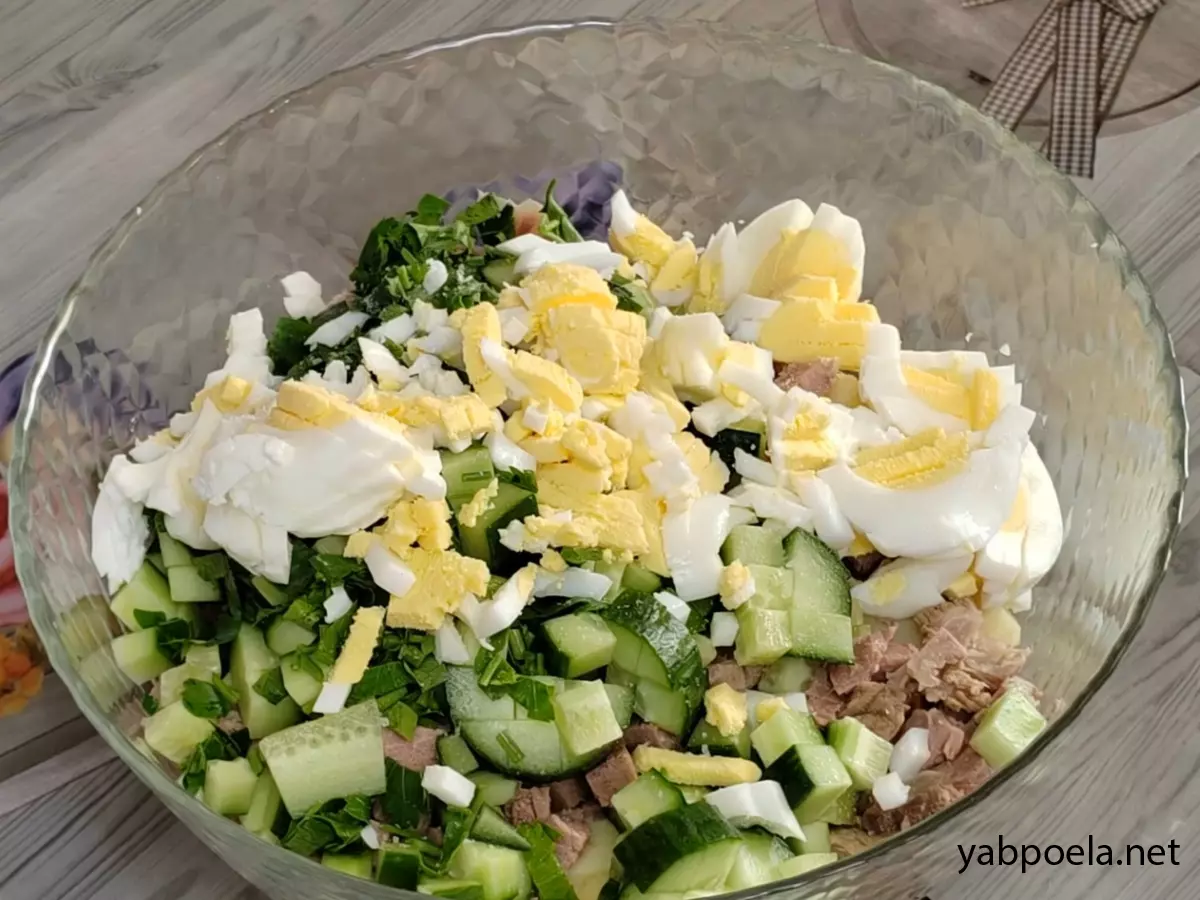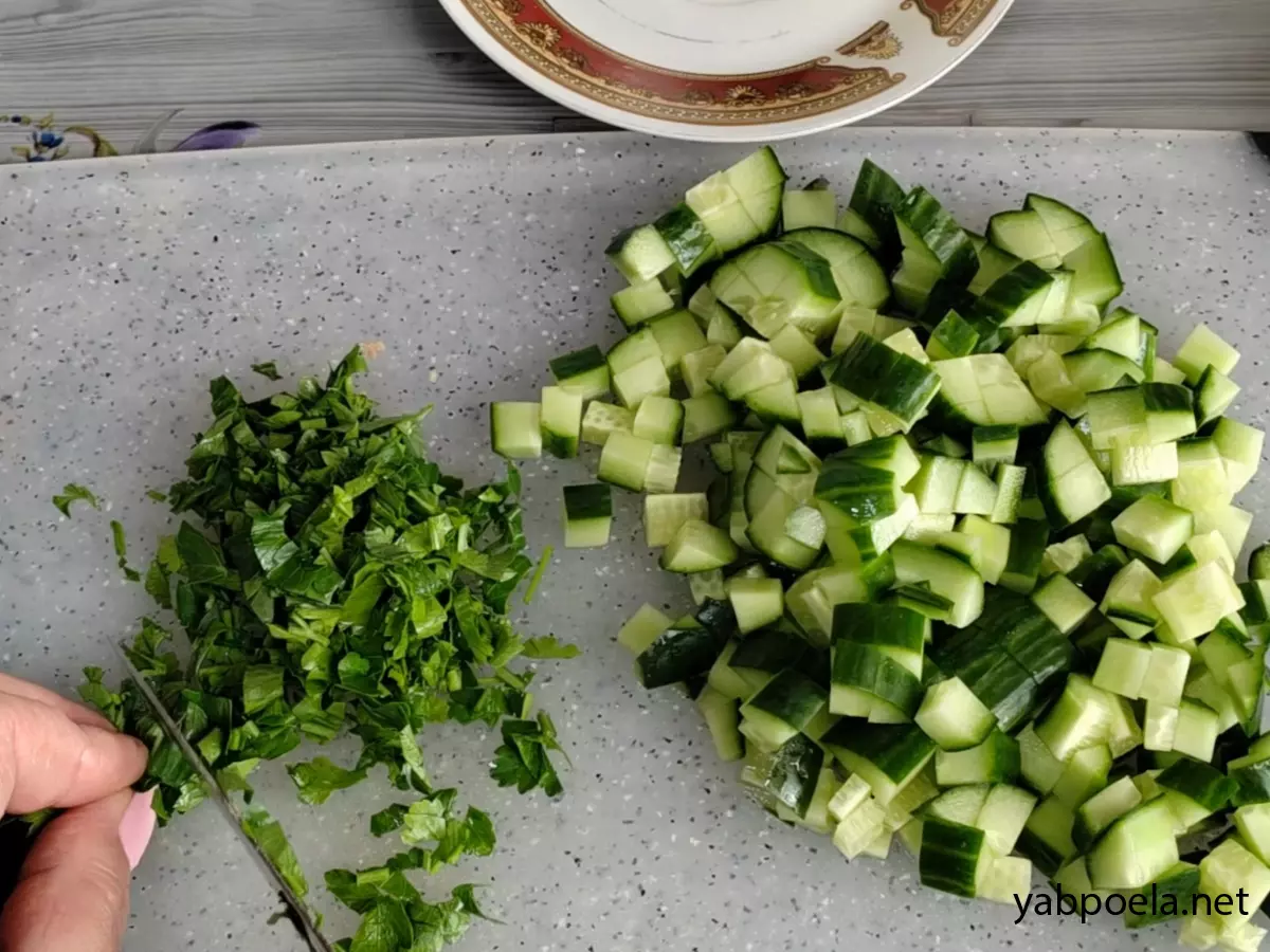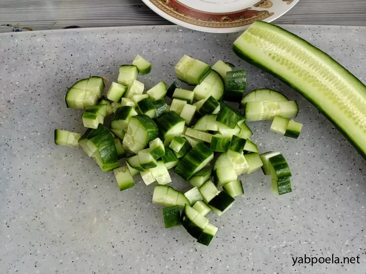 Свіжий огірок наріжте кубиком. Огірок додасть салату приємної свіжості.